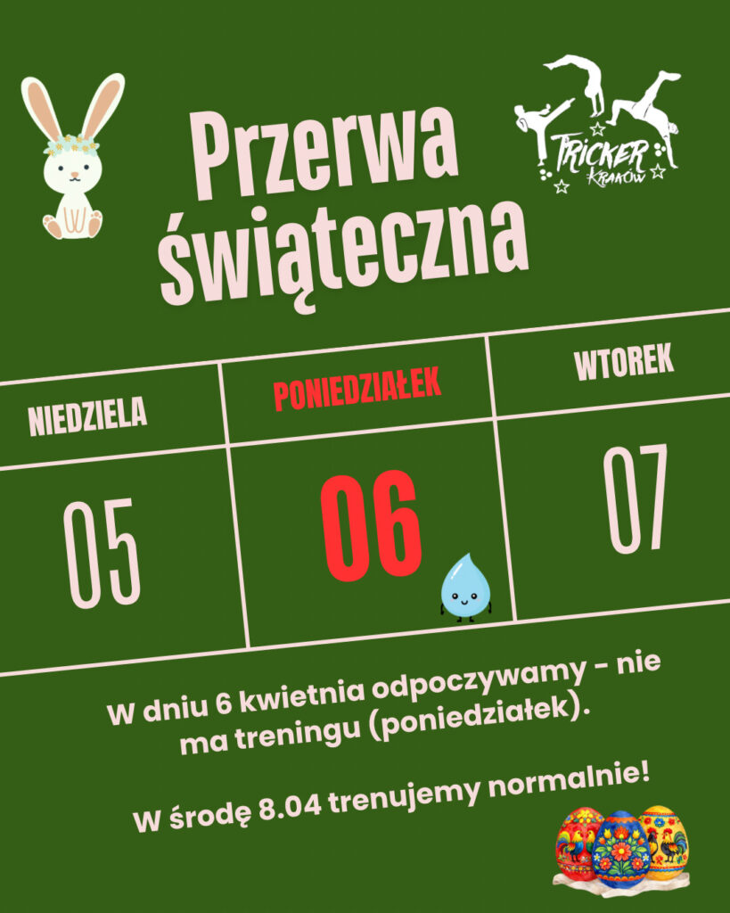 PRZERWA SWIĄTECZNA OBEJMUJĘ TYLKO I WYŁĄCZNIE PONIEDZIAŁEK WIELKANOCNY, POZOSTAŁE TRENINGI ODBYWAJĄ SIĘ BEZ ZMIAN.